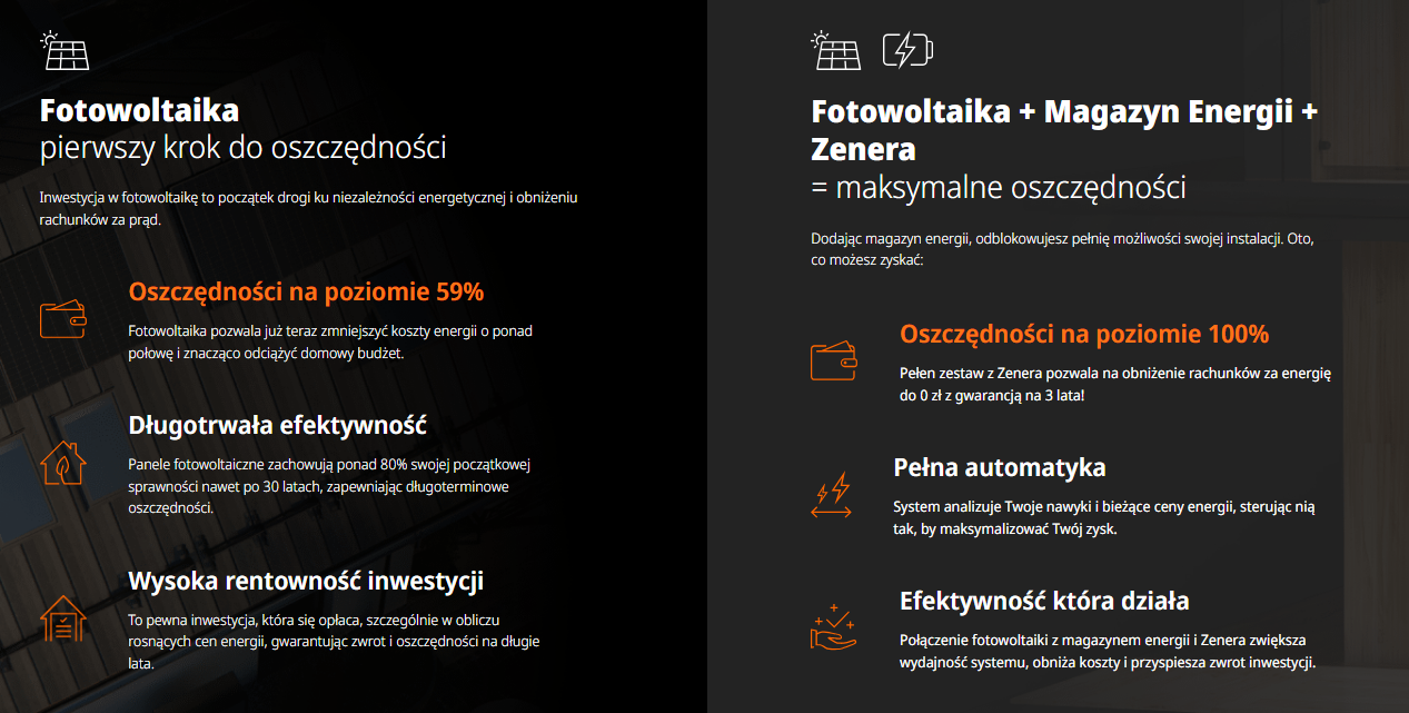 | Zarządzanie energią | Brak – zużywasz prąd tylko wtedy, gdy świeci słońce. | Zenera AI – inteligentne planowanie zużycia na podstawie pogody i cen. |