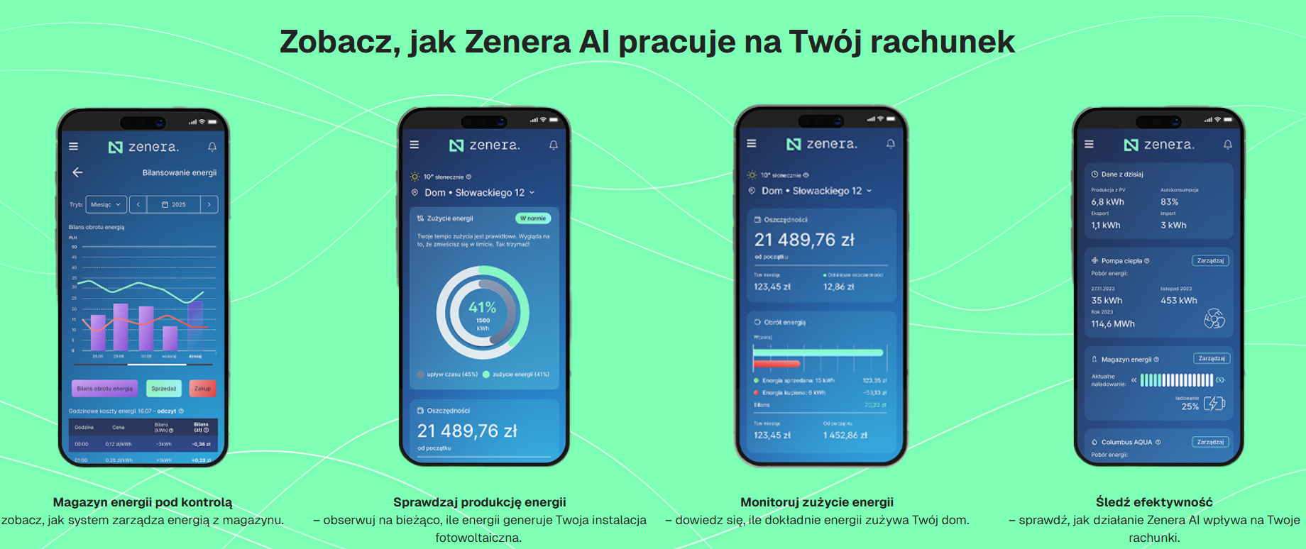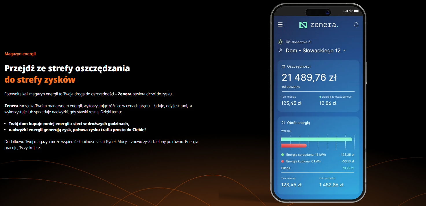 Zenera to najnowsza, bo powstała na przełomie 2025-2026 usługa, aplikacja mobilna oraz inteligentnty system zarządzenia energią elektryczną. Oferta Zenery gwarantuje na umowie, że rachunek za prąd wyniesie 0 zł. Technologia Zenera AI sprawia, że zwyczajny bank energii staje się inteligentnym magazynem energii. Zenera AI automatycznie zarządza pracą całej instalacji fotowoltaicznej i magazynu energii. System analizuje zużycie energii w domu, bierze pod uwagę rynkowe ceny energii i decyduje, kiedy prąd z sieci pobrać najtaniej, a kiedy sprzedać nadwyżki z zyskiem, którym Columbus – właściciel tej technologii – dzieli się z Tobą po połowie.