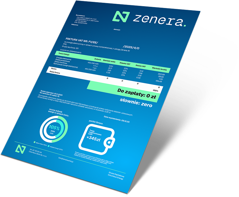 Rachunek O zł jest możliwy wyłącznie po spełnieniu warunków określonych w Regulaminie Oferty, Umowie i OWU, m.in. przy prawidłowym działaniu instalacji fotowoltaicznej i magazynu energii, utrzymaniu puli deklarowanego zużycia, korzystaniu z aplikacji ZENERA oraz niewprowadzaniu nowych, niezgłoszonych odbiorników energii.